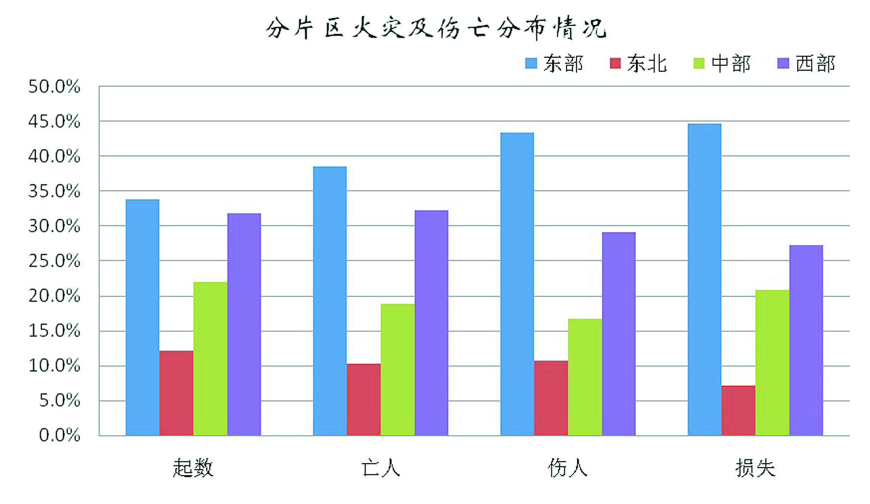 東部地區(qū)經(jīng)濟(jì)總量大、人口密集,火災(zāi)荷載大、風(fēng)險(xiǎn)高,東部10個(gè)省(直轄市),即京、津、冀、滬、蘇、浙、魯、閩、粵、瓊共發(fā)生火災(zāi)8萬(wàn)起,造成543人死亡、347人受傷、直接財(cái)產(chǎn)損失達(dá)15.1億元,分別占總數(shù)的33.9%、38.6%、43.5%和41.5%。
