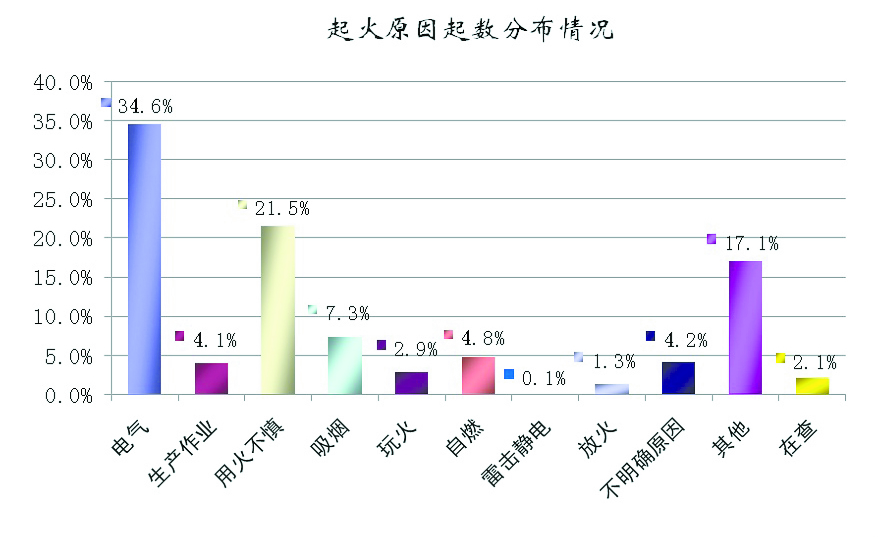 因違反電氣安裝使用規(guī)定引發(fā)的火災(zāi)起數(shù)占全年火災(zāi)起數(shù)的34.6%。生活中因用火不慎引發(fā)的火災(zāi)占全年火災(zāi)起數(shù)的21.5%。吸煙引發(fā)的火災(zāi)占全年火災(zāi)起數(shù)的7.3%。自燃引發(fā)的火災(zāi)占全年火災(zāi)起數(shù)的4.8%。生產(chǎn)作業(yè)不慎引發(fā)的火災(zāi)占全年火災(zāi)起數(shù)的4.1%。玩火引發(fā)的火災(zāi)占全年火災(zāi)起數(shù)的2.9%。放火引發(fā)的火災(zāi)占全年火災(zāi)起數(shù)的1.3%。雷擊靜電引發(fā)的火災(zāi)占全年火災(zāi)起數(shù)的0.1%。其他原因引發(fā)的火災(zāi)占全年火災(zāi)起數(shù)的17.1%。原因不明確引發(fā)的火災(zāi)占全年火災(zāi)起數(shù)的4.2%。起火原因仍在調(diào)查的火災(zāi)占全年火災(zāi)起數(shù)的2.1%。